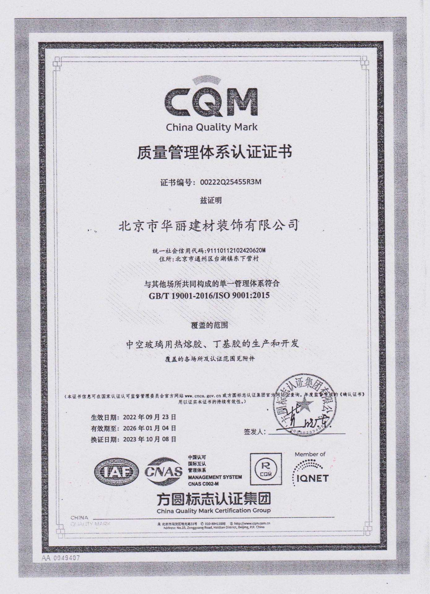 ISO9001:2015質量管理體系認證證書